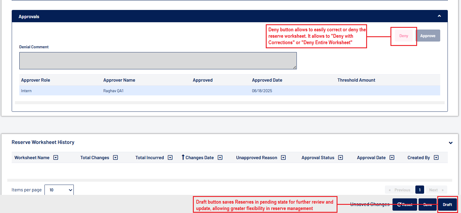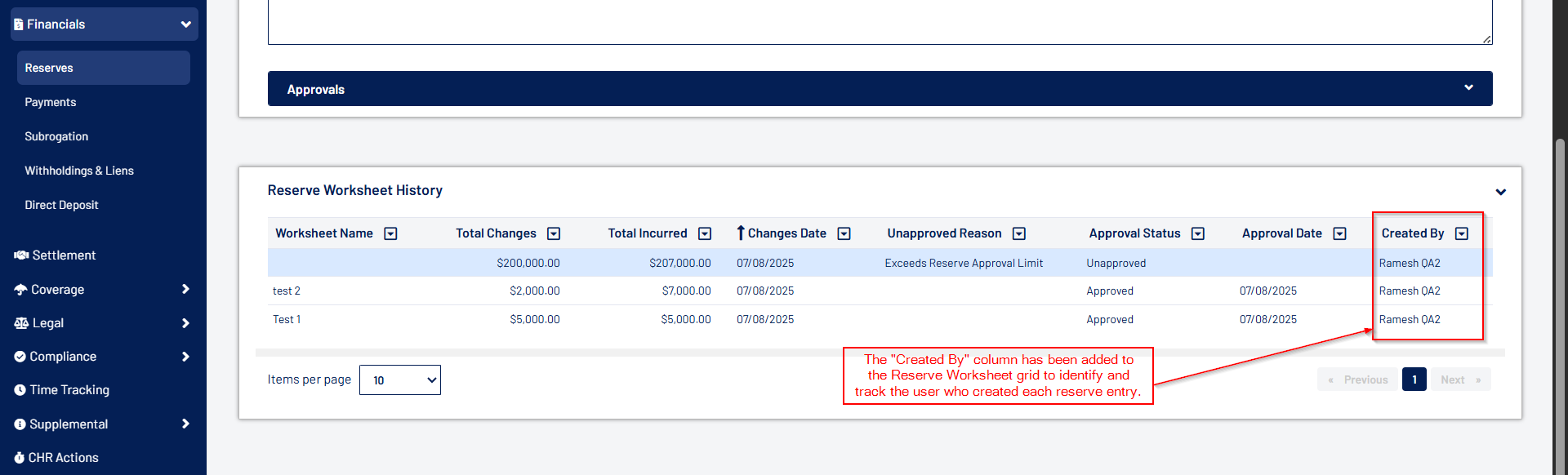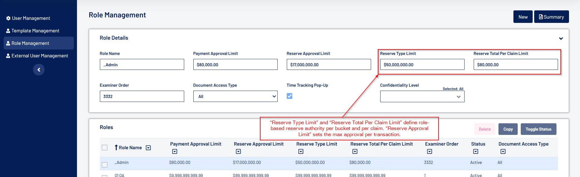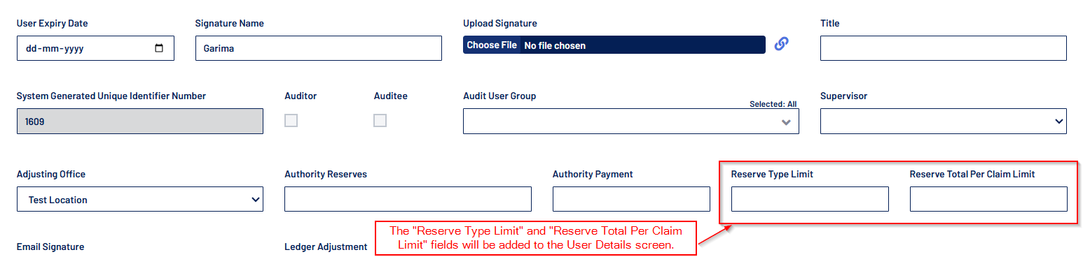 - Admin users can now set the "Reserve Type Limit" and "Reserve Total Per Claim Limit" at both the User and Role levels. The "Reserve Type Limit" defines authority over each reserve bucket, while the "Reserve Total Per Claim Limit" governs authority to create or approve reserves at the claim level.