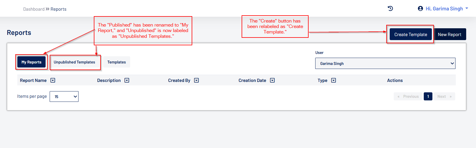 - The grid columns can now be sorted and filtered. “Published” button is now relabeled as “My Reports” and “Unpublished” is relabeled as “Unpublished Templates”