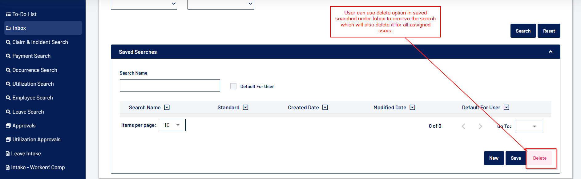 - A “Delete” button is added allowing the Admin user to delete the admin saved search. Deleting an admin saved search will delete it from all the assigned users.