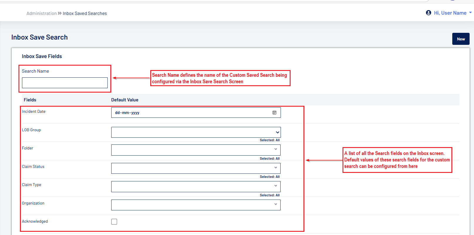 - Standard Inbox Searches can be configured in the Administration section via the “Inbox Saved Searches” configuration screen.