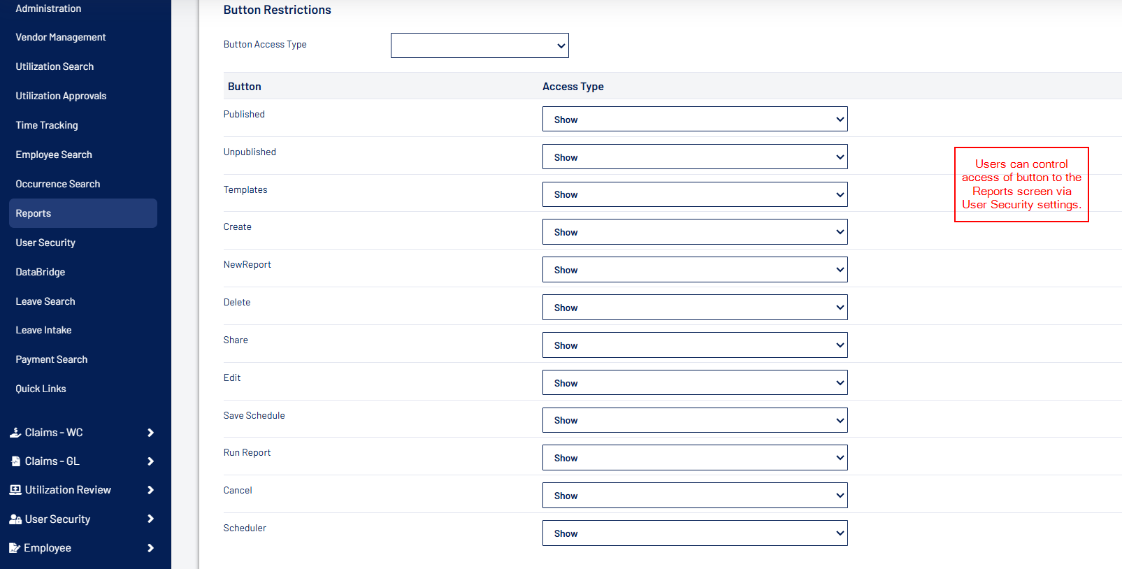 - Expanded admin privileges to manage field-level behavior for General Liability (GL) and Vendor Management screens, aligning them with existing Workers’ Comp (WC) configurations.