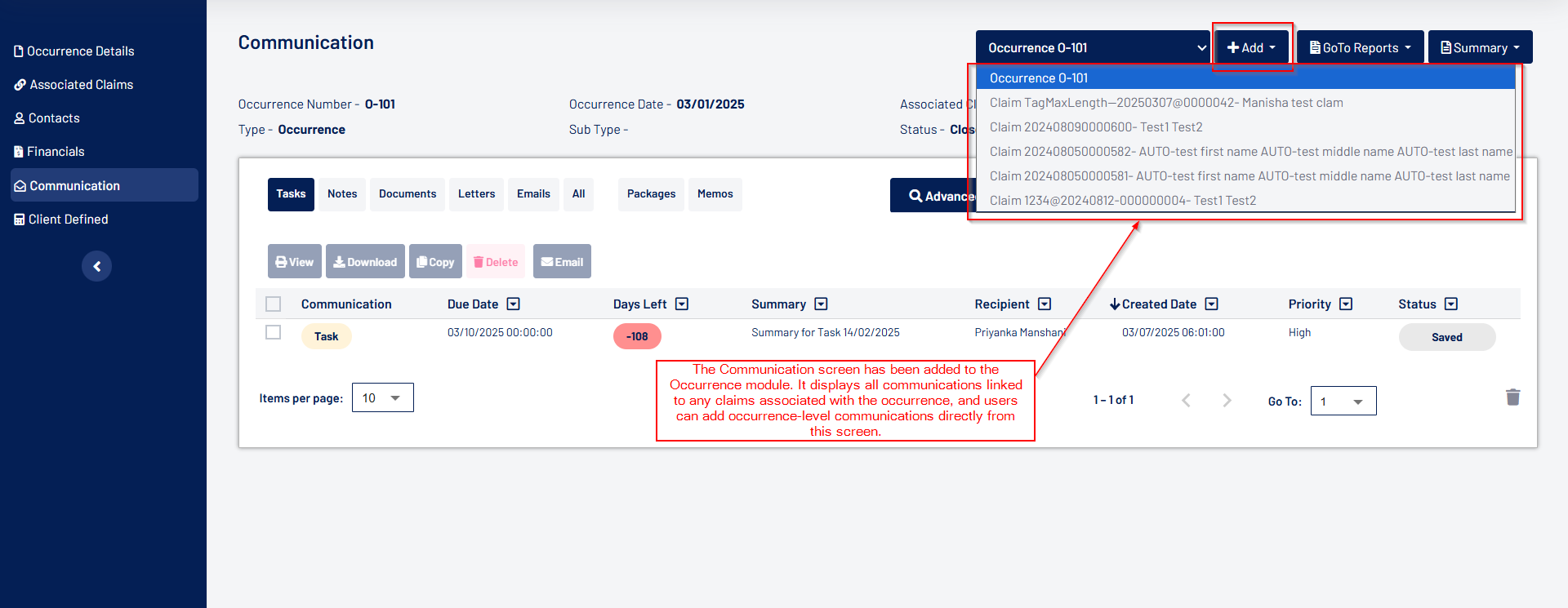 - The Communication screen within an Occurrence allows users to add new communications and view communications for claims linked to the Occurrence.