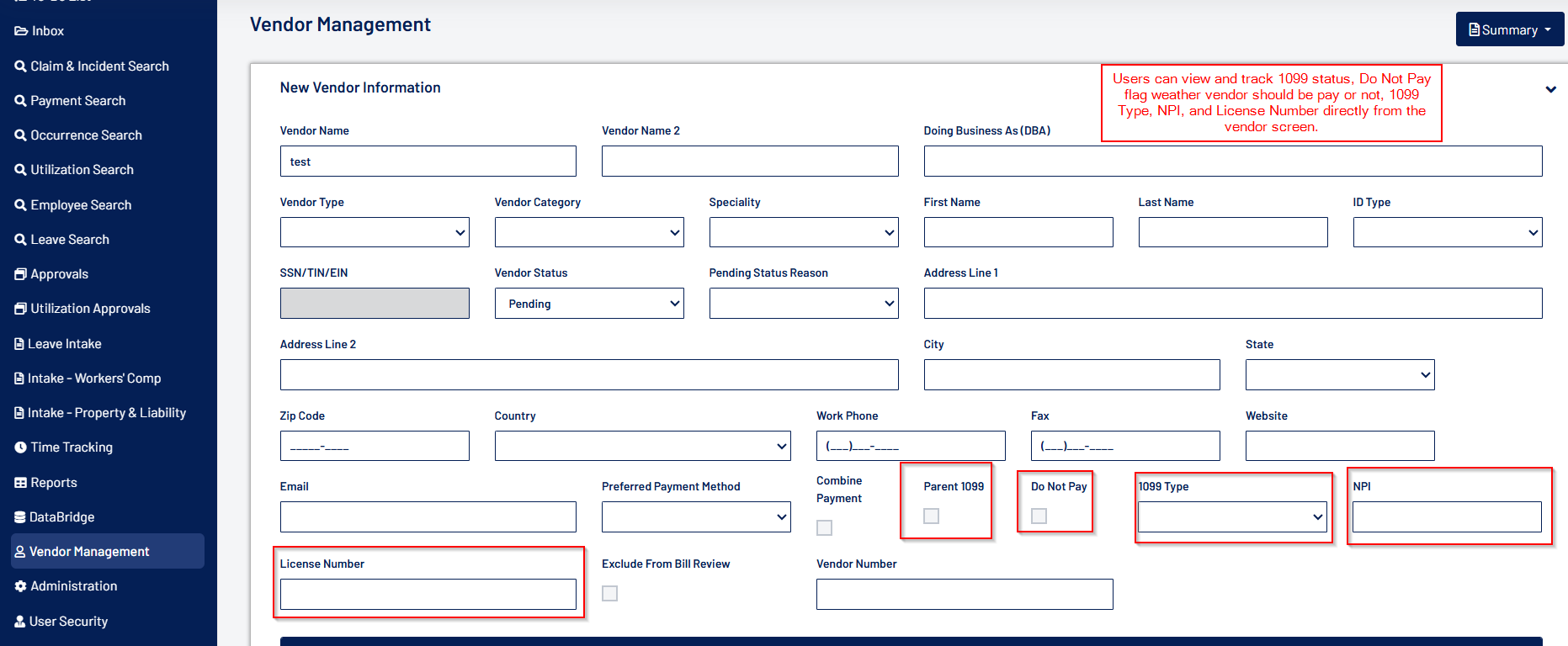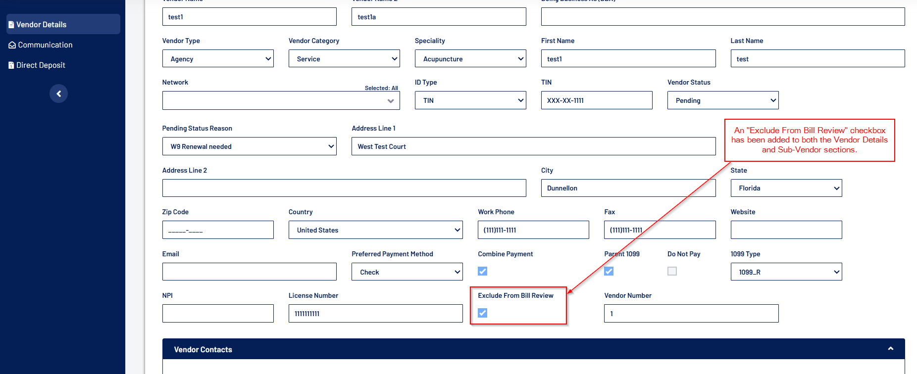 - “1099”, “1099 Type”, “Do Not Pay”, “NPI”, and “License Number” fields are added to the Vendor Management and Vendor Details screen for the user to record the respective vendor details.