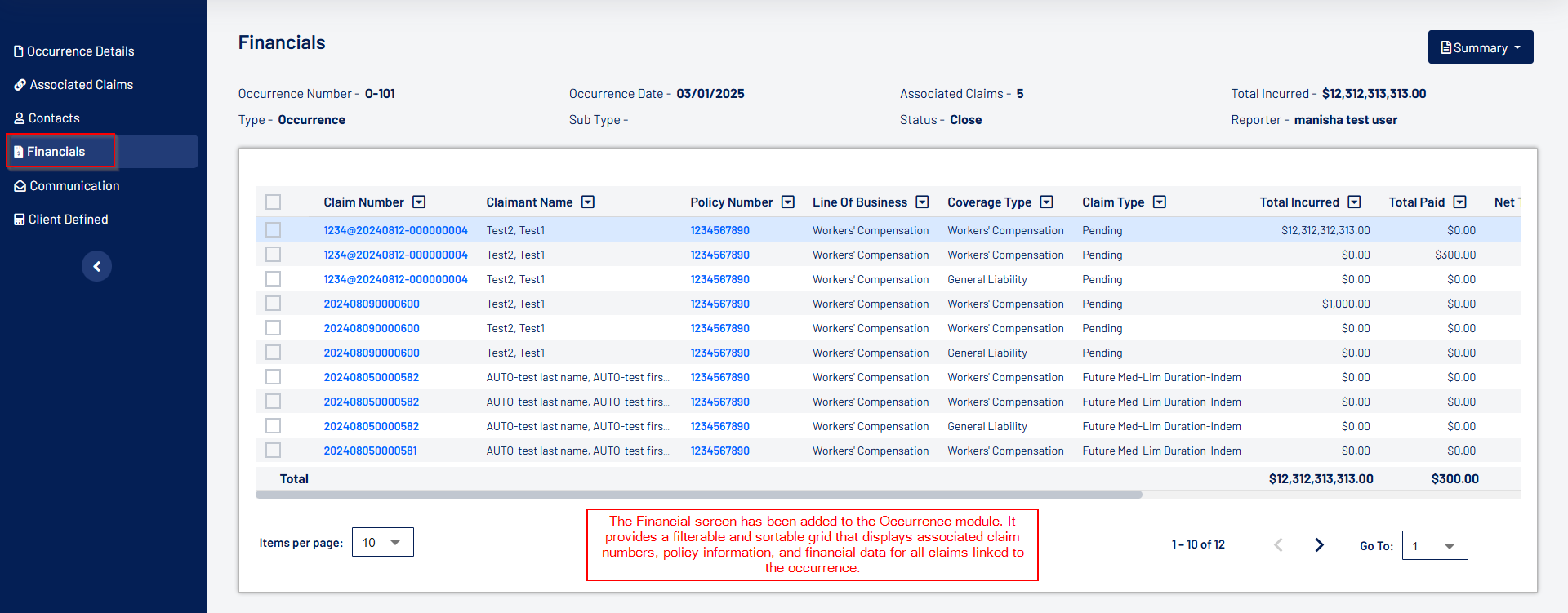 - "Financials" is a left navigation action item within an Occurrence. The Financials screen features a filterable, sortable grid displaying associated claim numbers, policy details, and financial for associated claims within the Occurrence.