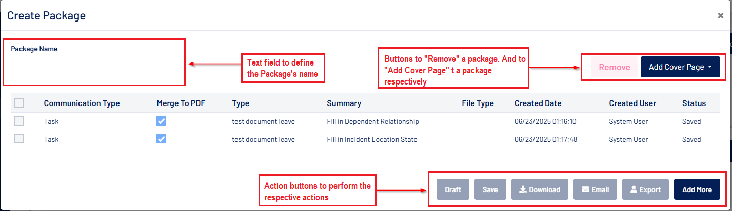 - If no communication is selected, clicking the button opens a pop-up to select a predefined package.