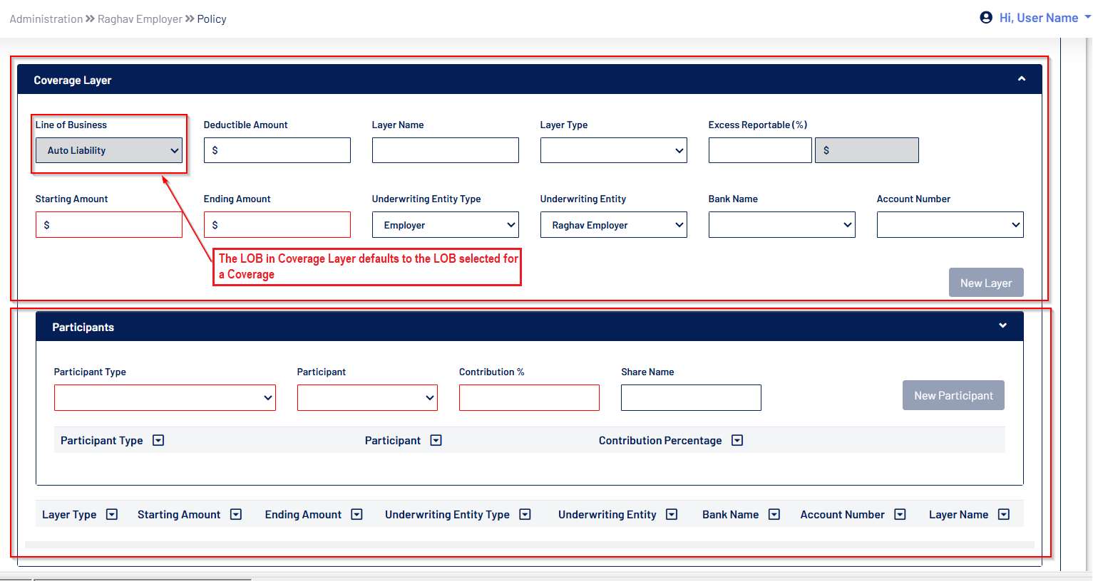 - Selecting a Line of Business for a Coverage defaults to the Coverage Layer, restricting subsequent layers to the same LOB.