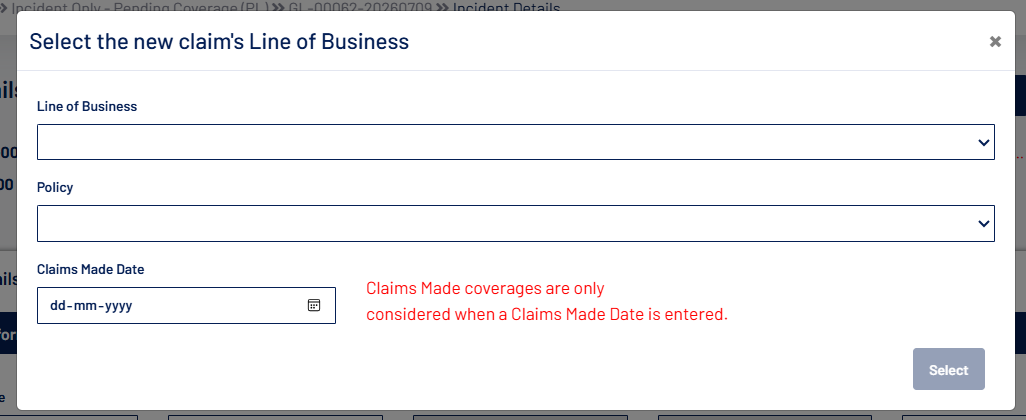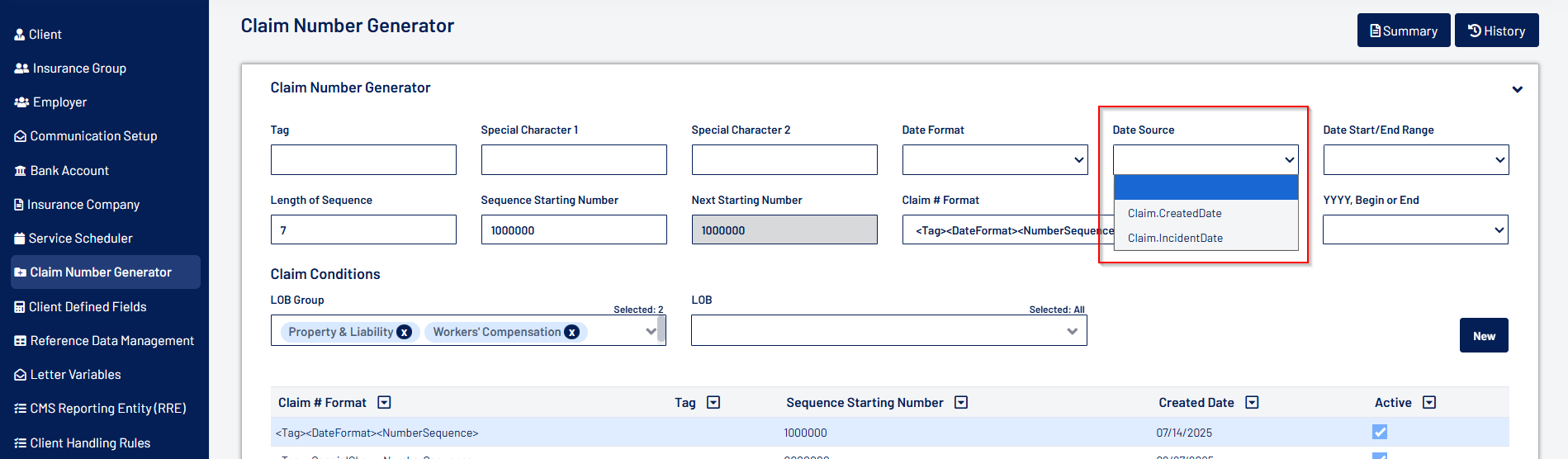- Users can now select the date source for claim number generation. Added LOB Group and LOB filters under "Claim Creation". Both defaults to Select All.