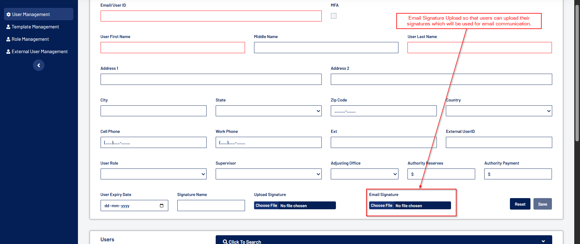 Key Features of the External User Management screen includes: