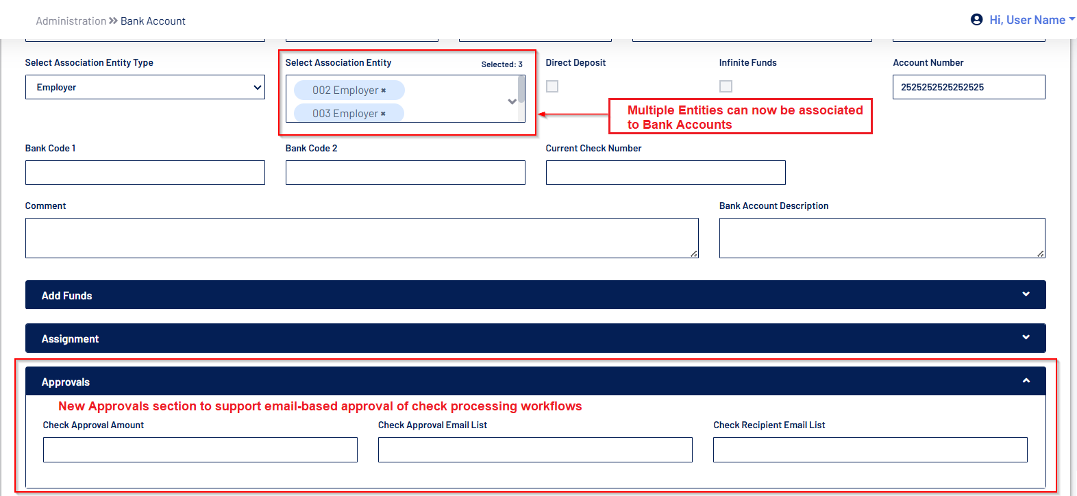 - The "Expiration Date" and "Low Threshold Funds" fields have been added to the Bank Account screen. Additionally, a new "Assignment" portlet is now available, enabling Admins to assign users to the Bank Account.