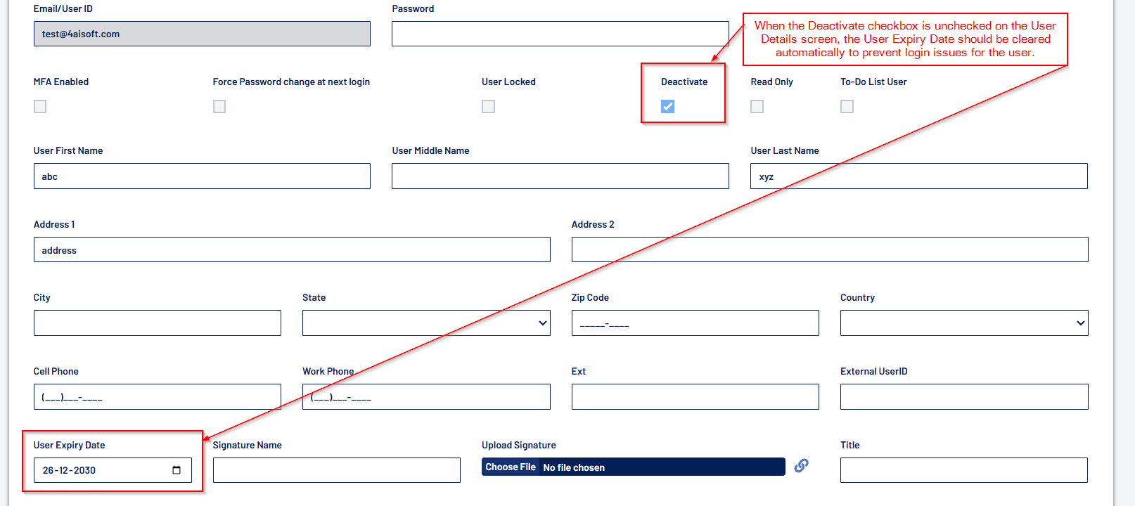 - When the Inactive box is unchecked in the user details section, the user expiry date will be cleared automatically, ensuring that the user can log in without encountering any issues related to expired access.