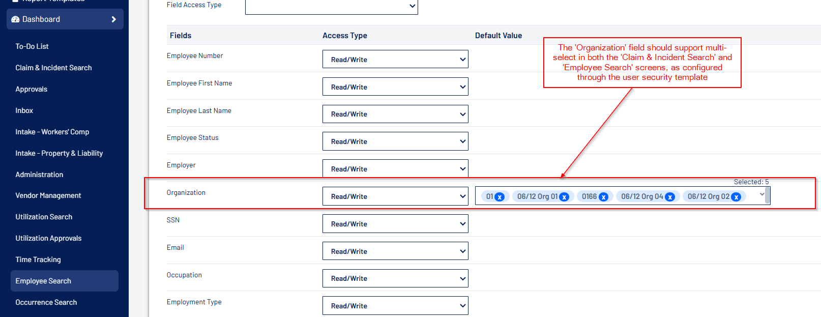 - The “Organization” field on the Claim Search and Employee Search screens, within a template, is now multi-select dropdown.