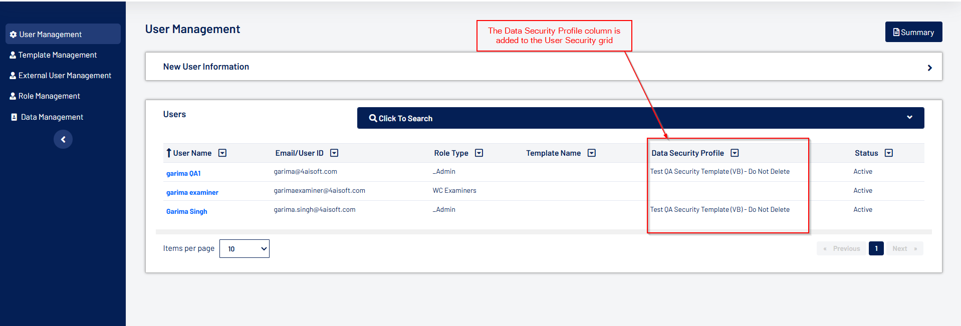 - A new 'Data Security Profile' column has been added to the User Security grid.