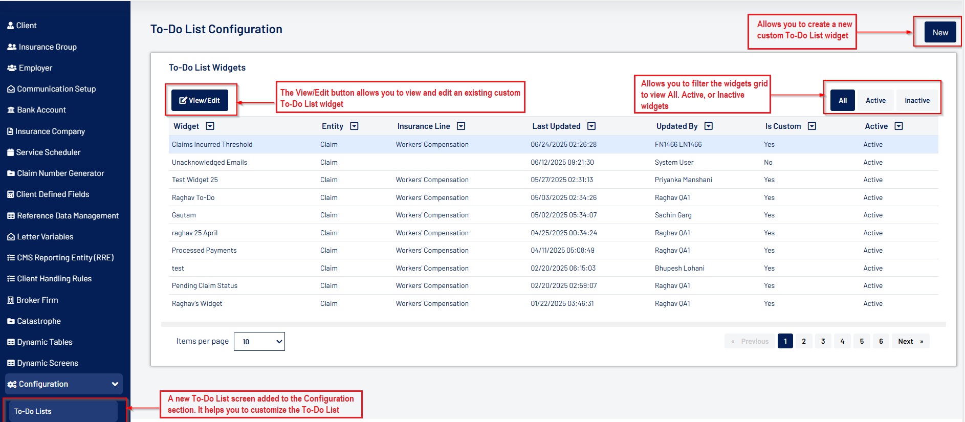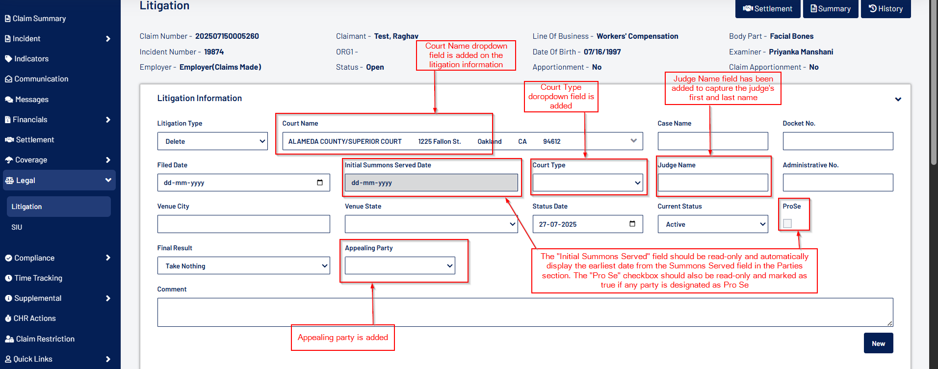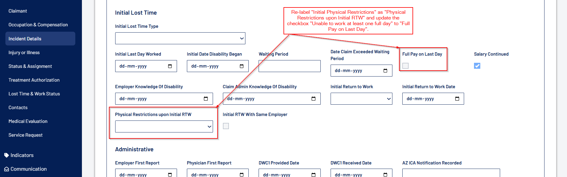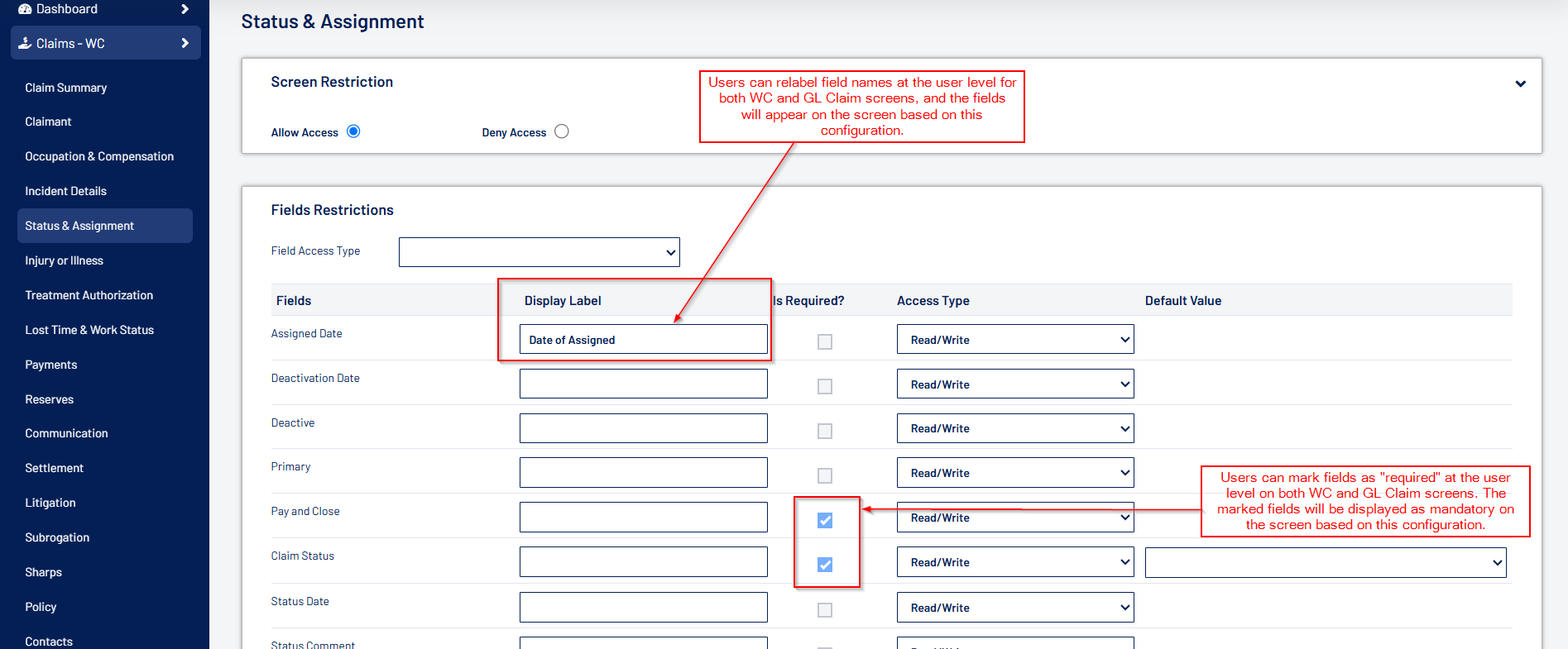 - Fields can now be relabeled and set as “Required” at the user level for various WC and GL Claim screens, including Claim Intake, Assignment & Adjudication, Injury, Treatment, Litigation, Settlement, and more.