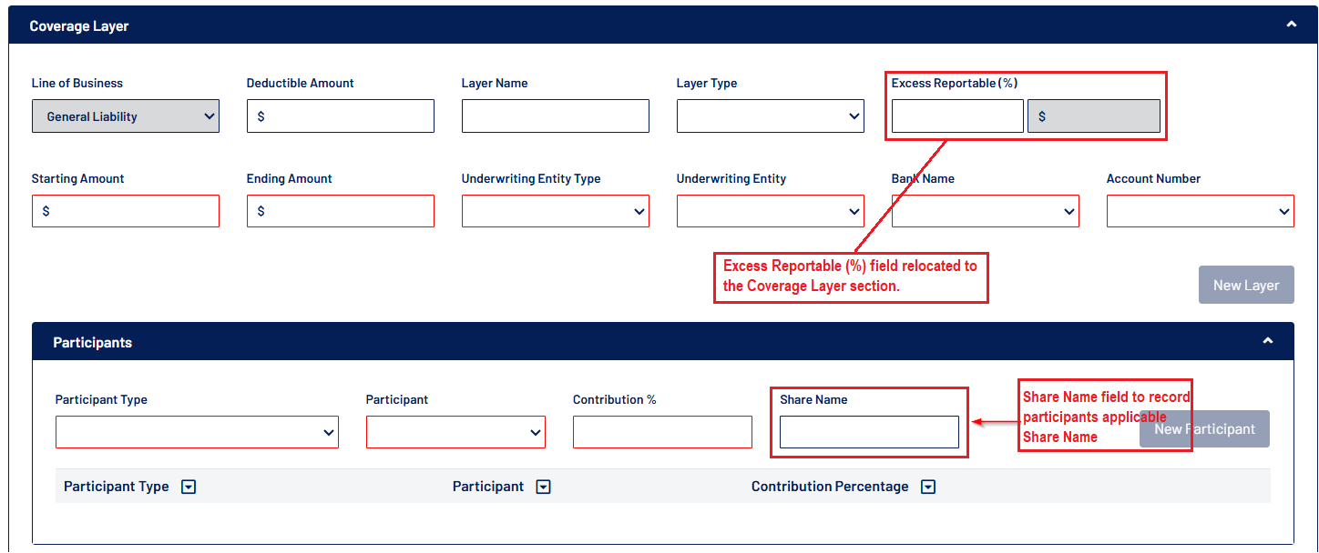 - The “Excess Reportable (%)” field has been relocated to the Coverage Layer section for improved context and usability.