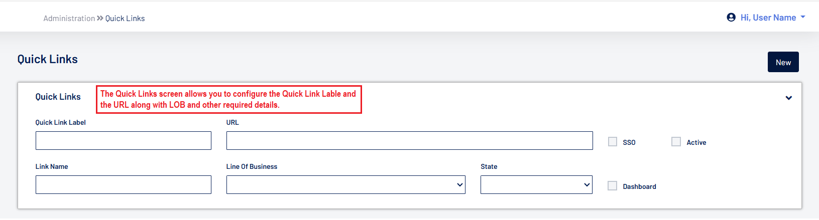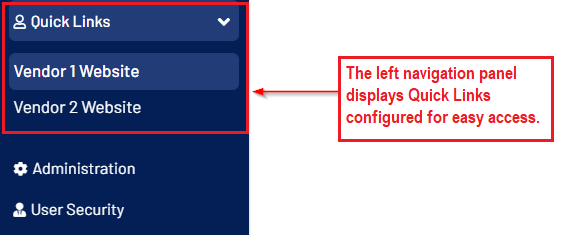 - A new "Quick Links" screen has been added under System Configuration, enabling users to configure website URLs. These URLs will appear as child links under Quick Links on the initial left navigation panel and will open in a new tab when clicked.