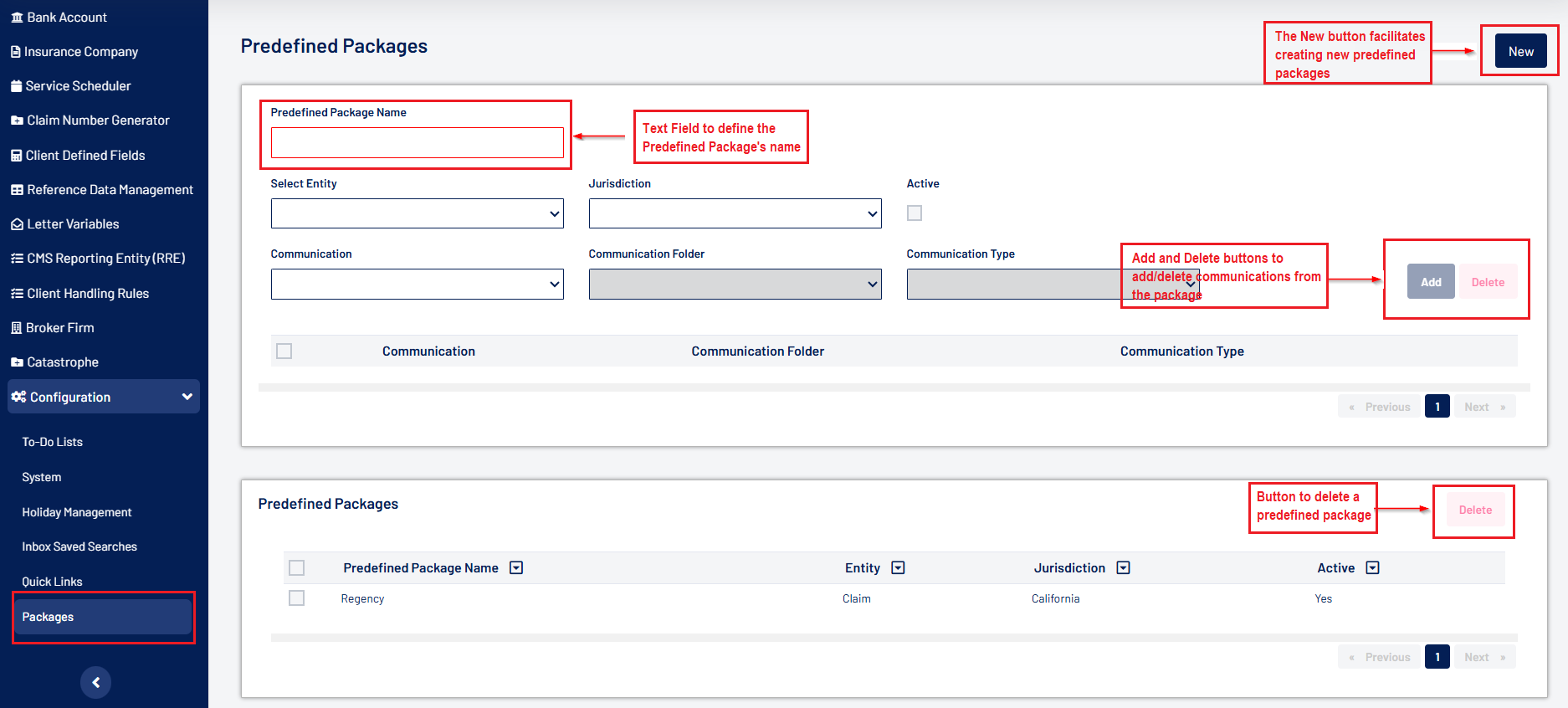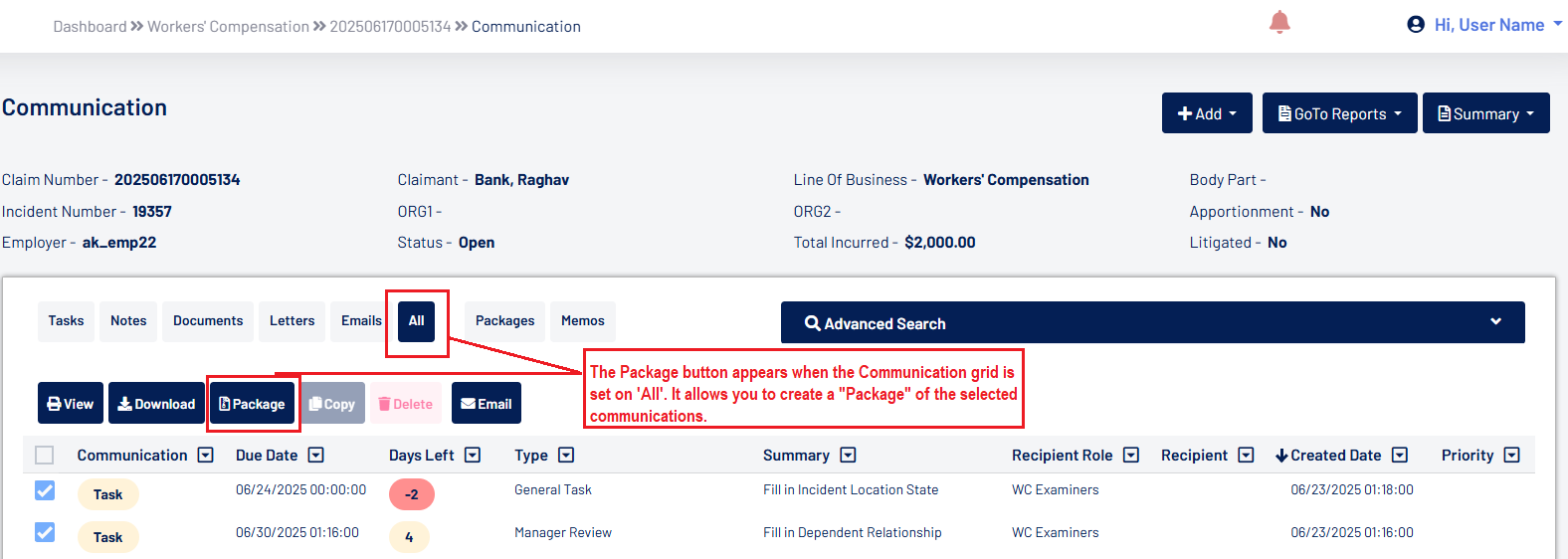 - A new Packages screen has been added under Administration> Configuration to allow users to create predefined communication packages. On the Communication screen within a claim, the Package button is now always enabled under the "All" filter: