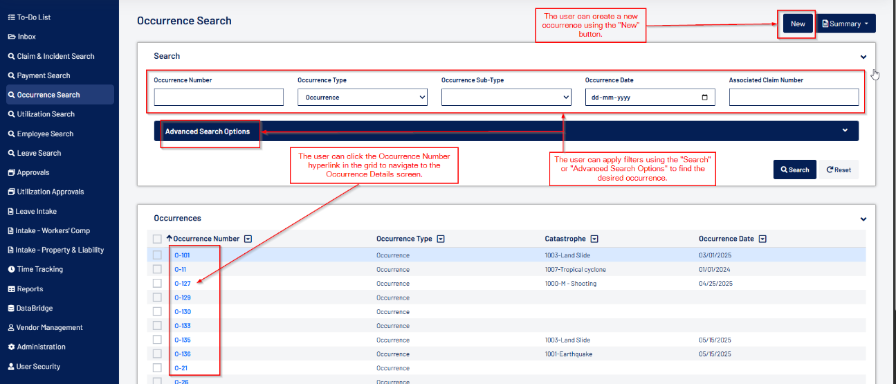 - Occurrence Search lets you search for existing occurrences in the system using basic and advanced filters.