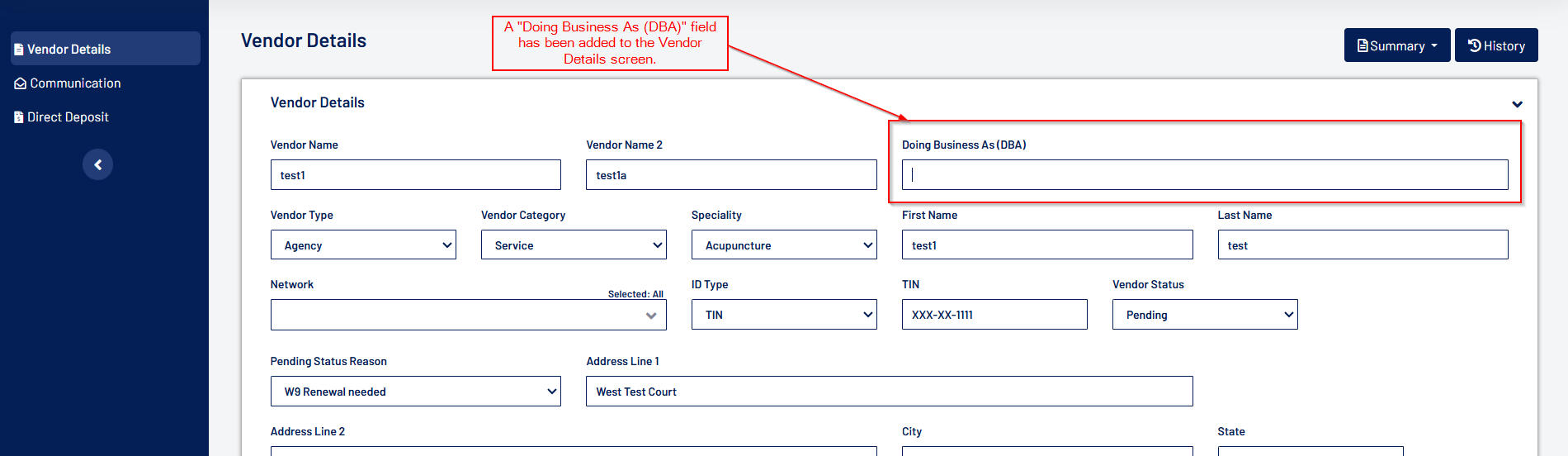 - Added a new "Doing Business As (DBA)" field on the Vendor Details screen.