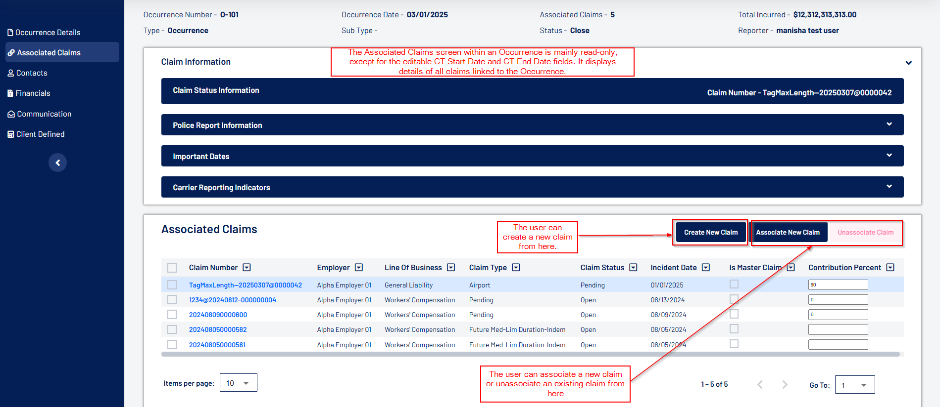 - The Associated Claims screen within an Occurrence is mostly read-only, with editable CT Start Date and CT End Date fields. It displays details of claims associated with the Occurrence. Users can associate new claims, unassign existing ones, and designate the Master Claim. The grid also allows users to set the Contribution Percent for Continuous Trauma claims.
