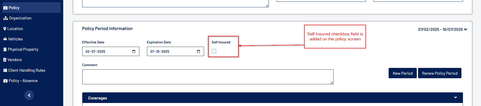 - A new Self-Insured field is added to the Policy Period UI, within the Policy Period panel.