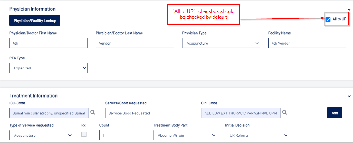 - The “Create RFA” button opens a New RFA pop-up to record Physician and Treatment Information. The system will create a memo linking the source document to the treatment record, which is saved when the treatment record is saved.