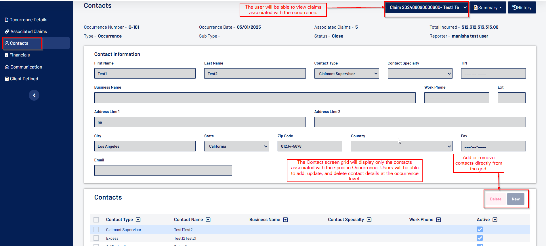 - The Contact screen within an Occurrence allows users to add, delete, or update contact details at the occurrence level. It also enables viewing contacts associated with claims linked to the Occurrence.