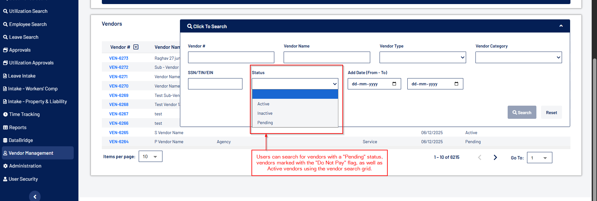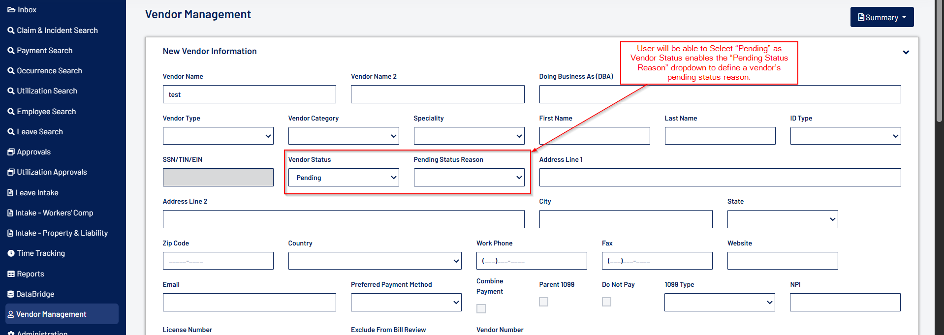- Selecting “Pending” as Vendor Status enables the “Pending Status Reason” dropdown to define a vendor’s pending status reason.
