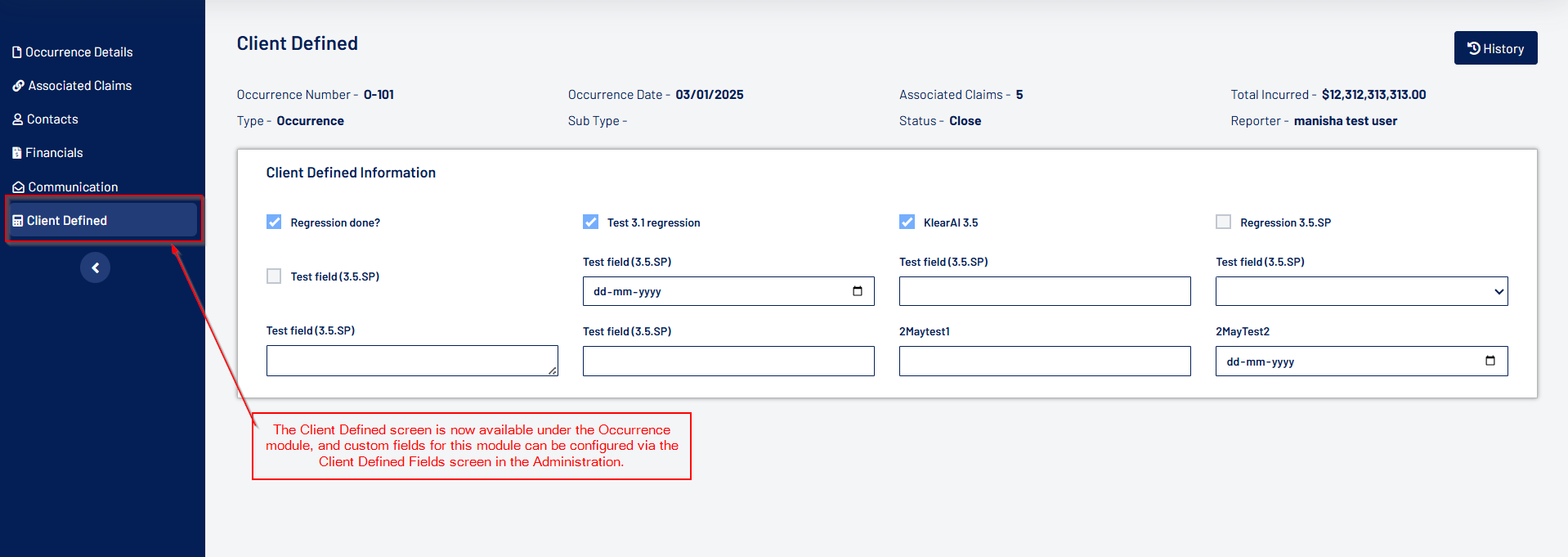 - Custom fields for the Occurrence Module can now be configured in the Client Defined Fields screen within the Administration section and will be displayed in the Occurrence's Client Defined Fields screen.