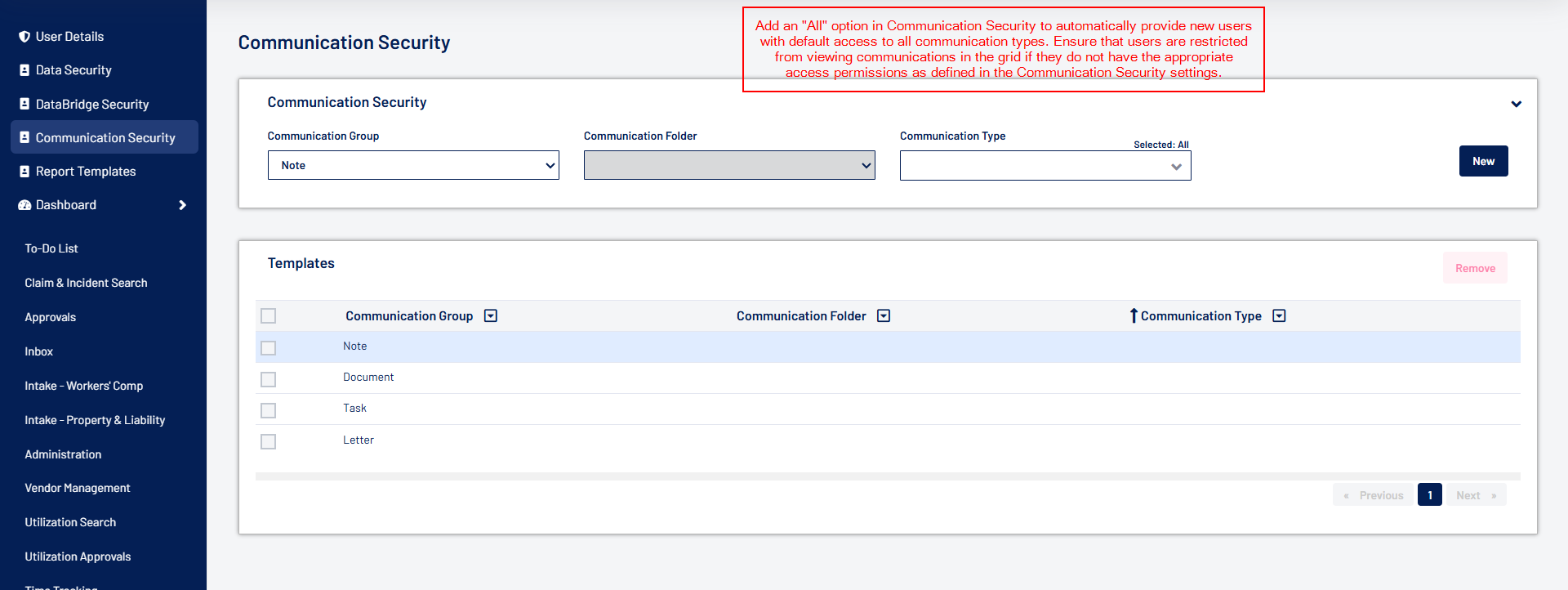 - User access to communications within claims is now controlled through Communication Security permissions. Selecting a specific Communication Type within a Communication Group grants access only to that type, while selecting the Communication Group grants access to all communication types within it.