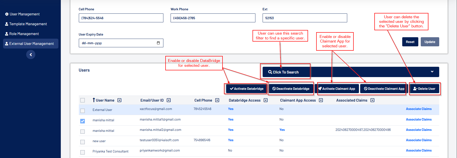 - Activation/Deactivation: Enable or disable DataBridge and Claimant App access for selected users.